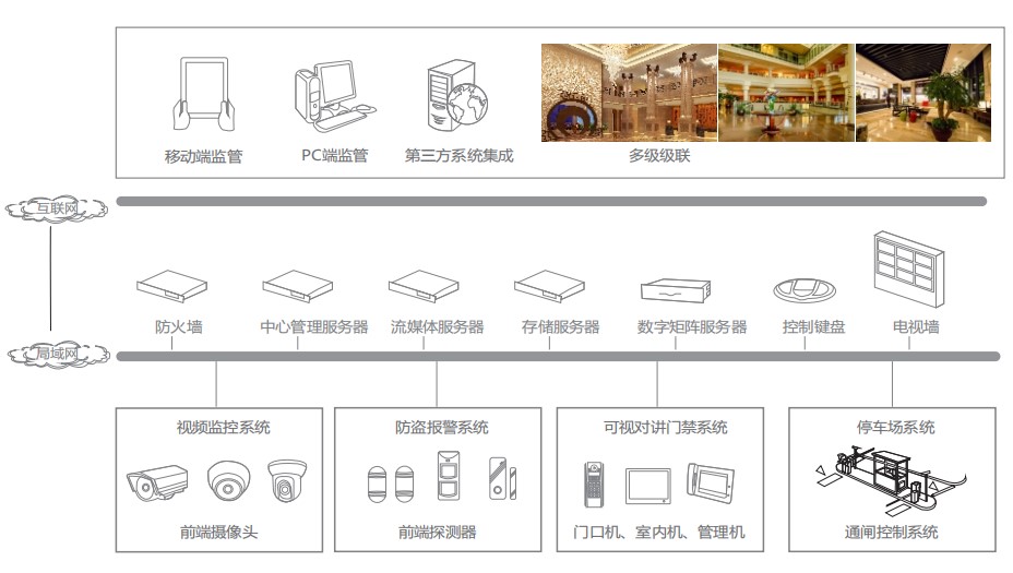 酒店具有人群流动性大、全天候营业、客人身份各异等特征,宾客的人身安全和财产安全都需得到有效保障,否则直接影响酒店的运营。因此建立高清、智能的视频监控系统是行之有效的安保手段。建设酒店的“明厨亮灶”工程,是政府的一项硬性指标,同时也能赢得顾客的肯定,增加客人的多次消费。