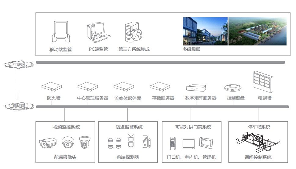 通过部署在周界挂臂设备箱的以太网光电转换器,以及部署在各楼层的接入交换机,作为前端设备的接入层网络设备,实现所有前端监控点的直接接入。