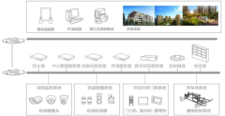 将同一项目的多个弱电分项系统进行规划,统一管理,建设一个居住安全舒适,服务功能齐全。同时满足物业管理人员高效、便捷管理的智能化小区;业主居住环境更加舒适、更加安全;提升房地产商的品牌价值,赢得更多经济效益。